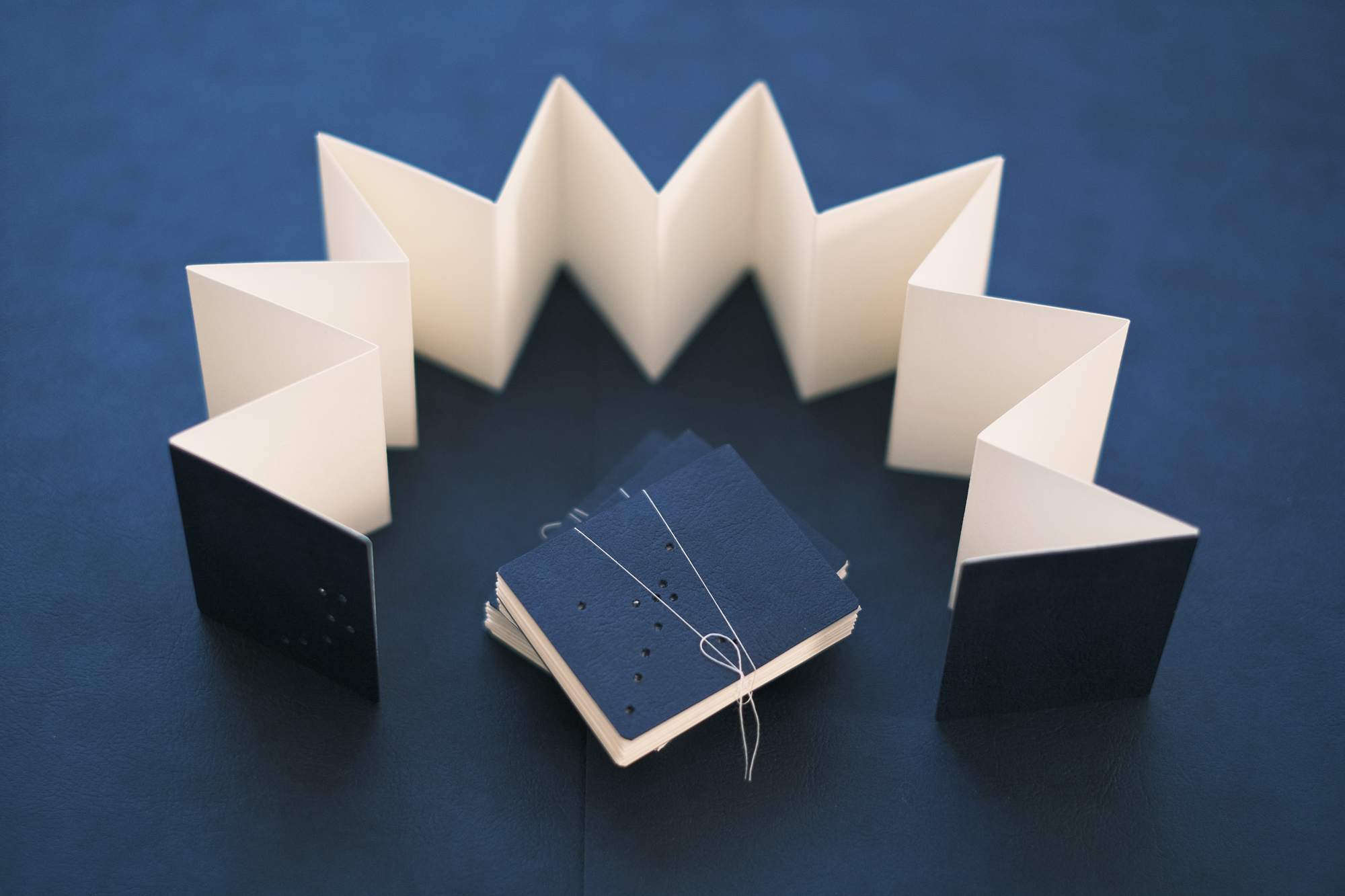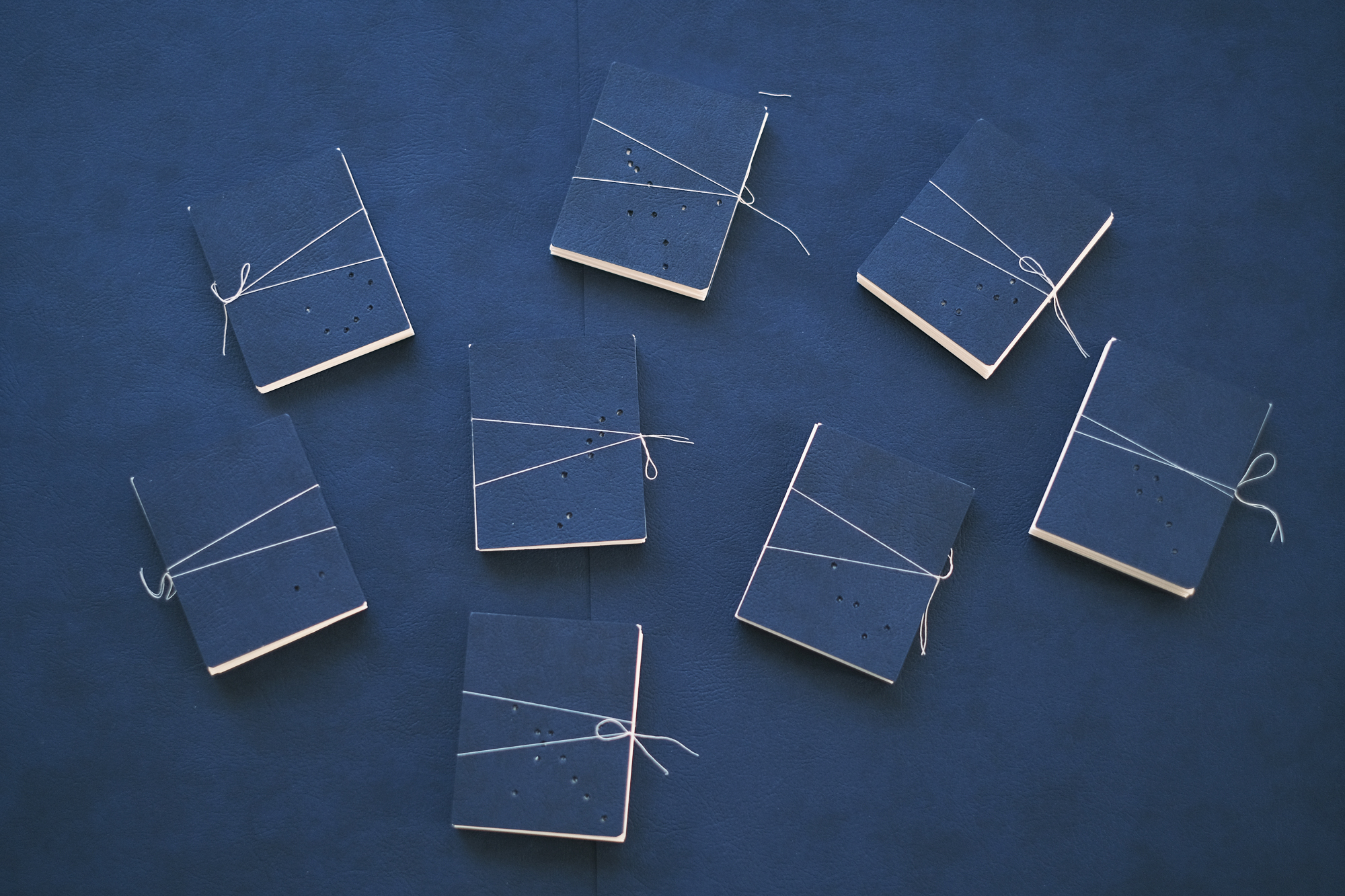 「みんなで自由に星空を描けたら」そんな想いで、夜空のような手製本を綴じました。星をつないで星座をみつけたり、あたらしい星や星座を想像したり、光にかざして掌サイズのプラネタリウムにしたり、自由におたのしみください。