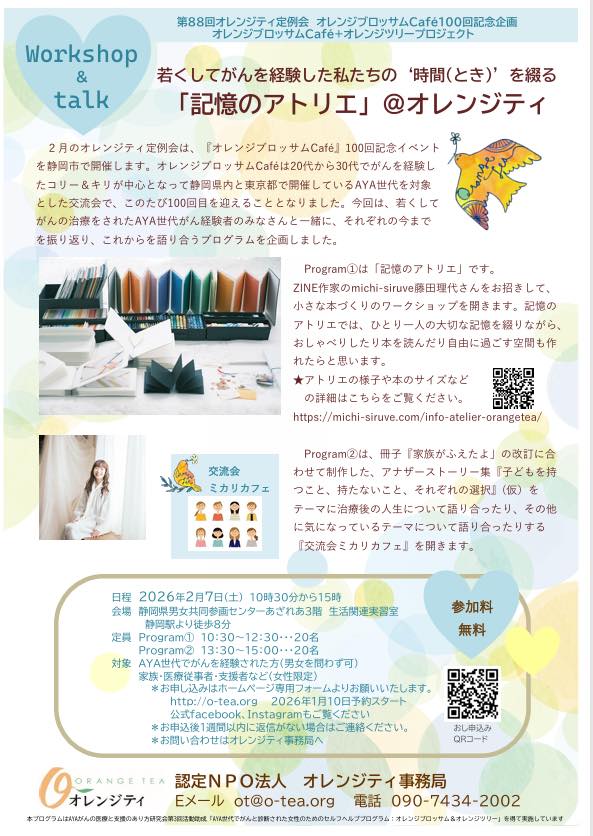 2026年2月7日(土)10:30~、認定NPO法人オレンジティさんからお声がけいただき、第88回オレンジティ定例会 オレンジブロッサムCafé100 回記念企画のプログラムのひとつとして、小さな本づくりのワークショップ「記憶のアトリエ」@オレンジティ – 若くしてがんを経験した私たちの‘時間 とき’を綴る –をひらきます。