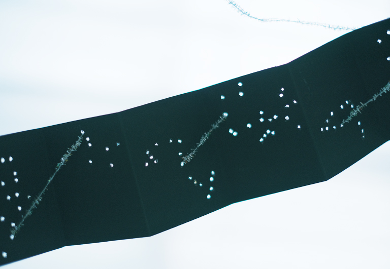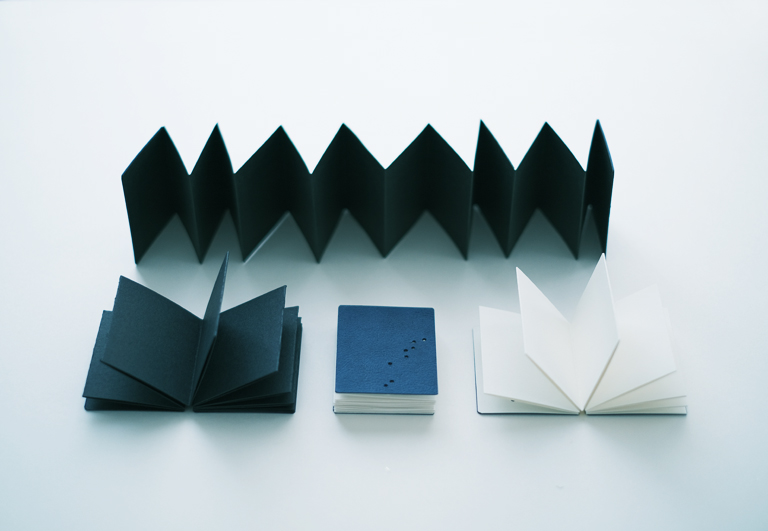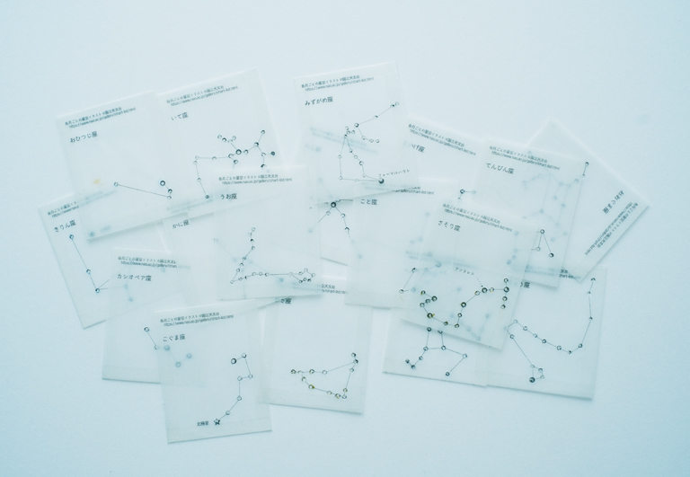 自分やご家族の星座を浮かべたいと、一生懸命印をつけてくれていた跡が残る星座シート。治療への想いを表現するために、ひらがなの活字の山から一文字ずつ探して本の中に並べてくれていた小さな活字たち。素材に宿る子どもたちの記憶をみつめながら、子どもたちのことを想っていただけたらうれしいです。