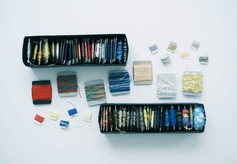 というイメージを預かり、自由に星座を描いたり、願いごとを綴ったり、光にかざすとちいさなプラネタリウムのようにもなる『yozora』という小さな手製本を綴じ、普段「記憶のアトリエ」で並べている道具や素材を持ち込みました。