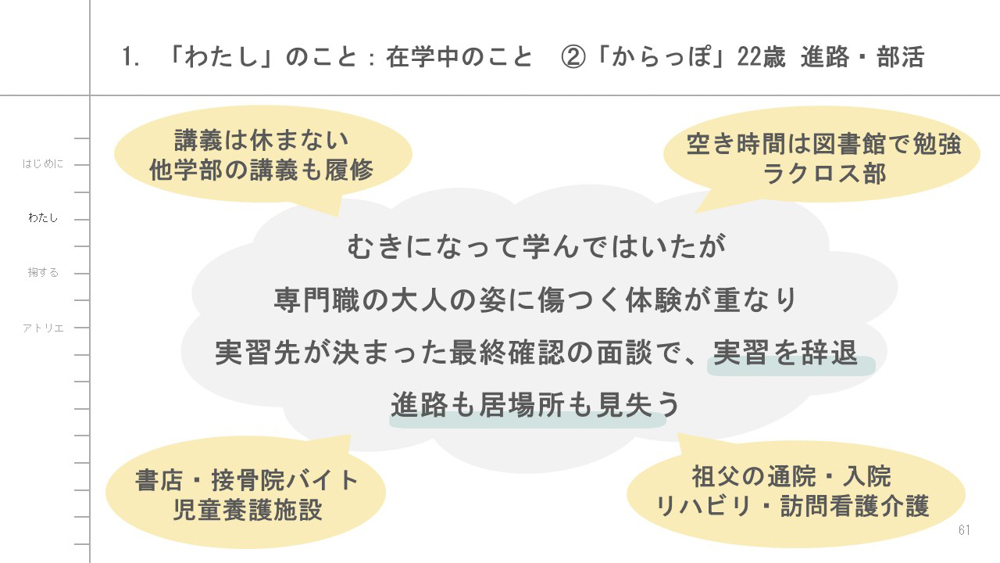 そこからバトンを受けとった後半の時間は、さまざまな当事者体験を抱えながら学生時代を過ごした一人の歩みとしてわたしの体験をお話して「わたし」をみつめ、分かちあうような時間に。