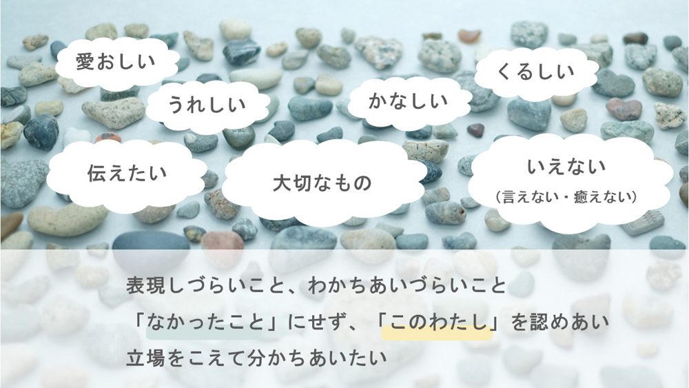 「大切なもの」を表現しあい、分かちあうことで和らぐものや育まれるもの。「独り」では難しくても「誰か」とならみつめられるもの。愛おしい、うれしい、伝えたい、かなしい、くるしい、いえない(言えない・癒えない)、いえる(言える・癒える)…どんな色合いのものも「大切なもの」として、ともにみつめ、分かちあってゆけたらいいなというささやかな願いもこめて、お贈りしました。