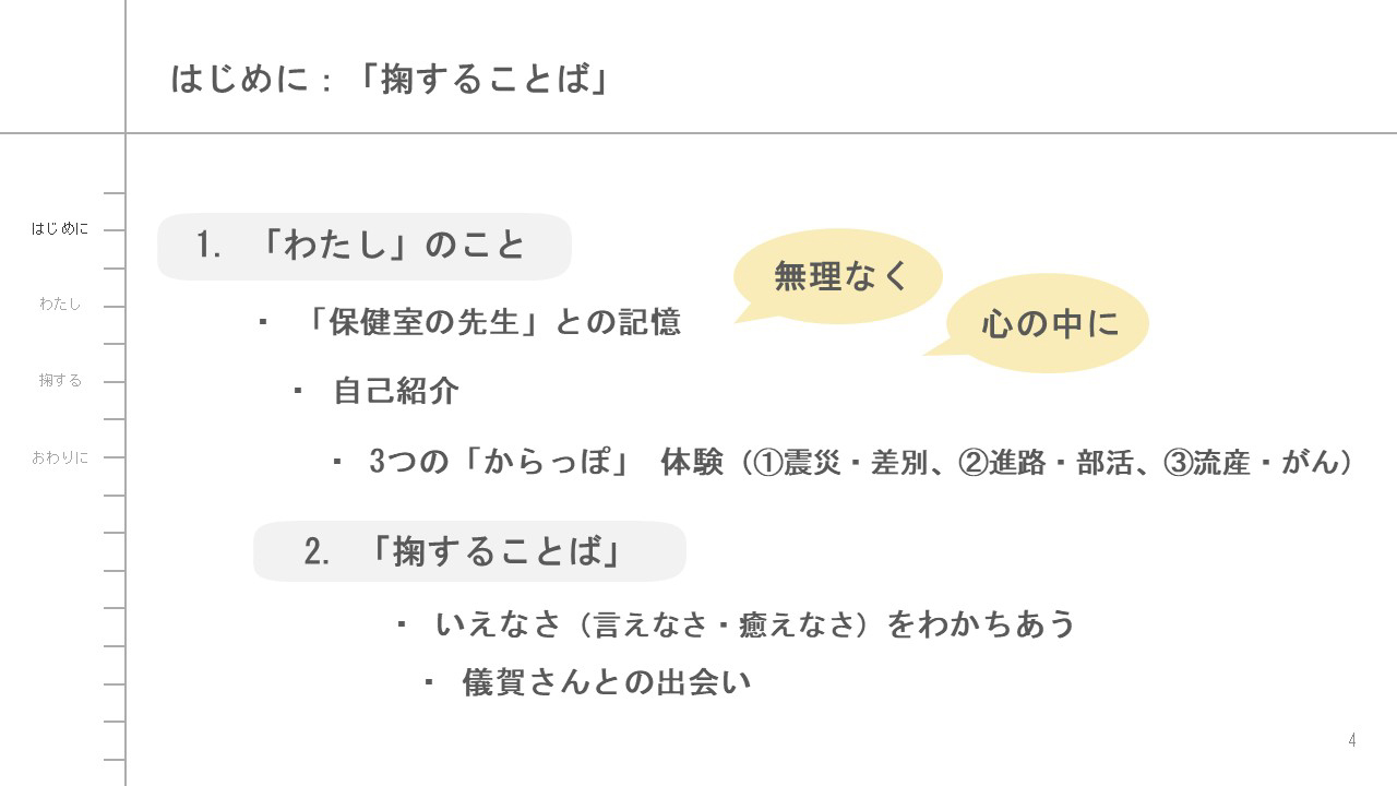 儀賀さんからわたしへの依頼は、これまでさまざまな学問を専攻する大学生のみなさんと見つめてきたように、わたし自身の学生時代から今日までの体験や感じてきたことを手渡しながら、学生のみなさんがご自身や大切な誰かの「わたし」をみつめ、分かちあうことについて感じられるような時間をという内容だったので、その芯の部分はそのままに。