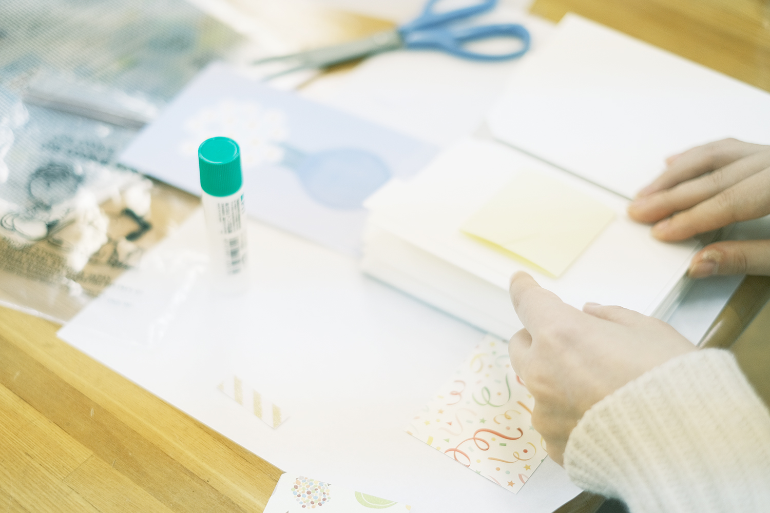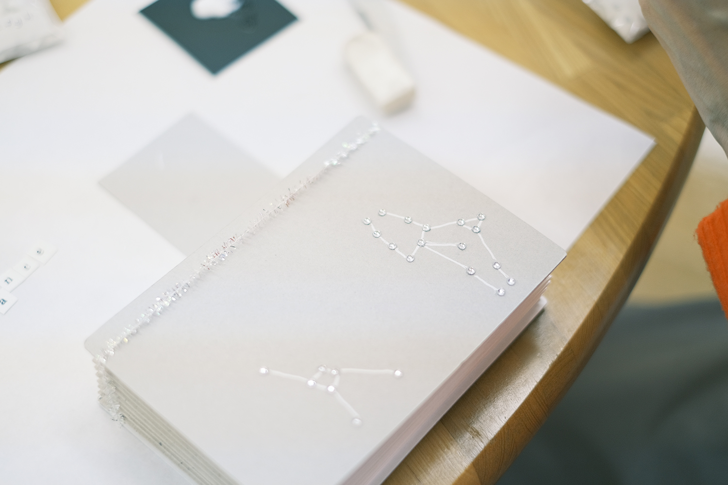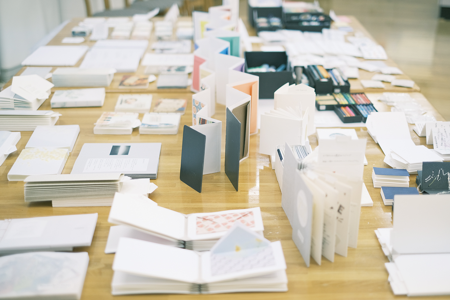 お越しくださるみなさんを想像しながらオレンジティのみなさんとご相談して、今回は「何人かで集ってわいわい制作できる島」を中心にしつつも「一人でじっくり向き合うことのできる島」もつくることに。窓際に道具や素材を並べる島をつくり、残された空間には角度やリズムをつけながら、作業をしたりお話ができそうな本づくりの島を5つほどつくり、みなさんをお迎えしました。