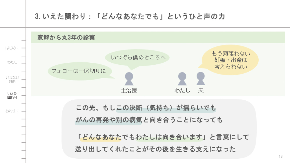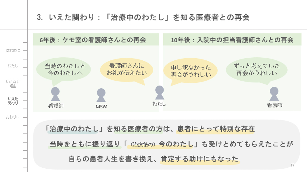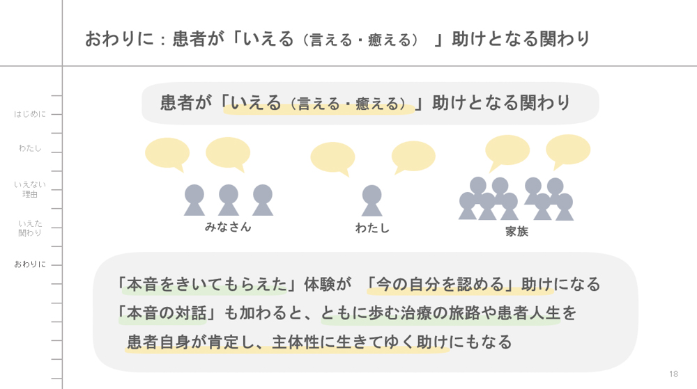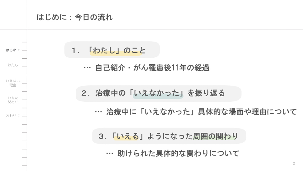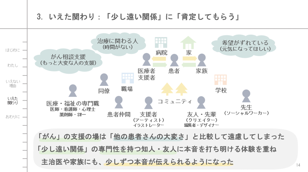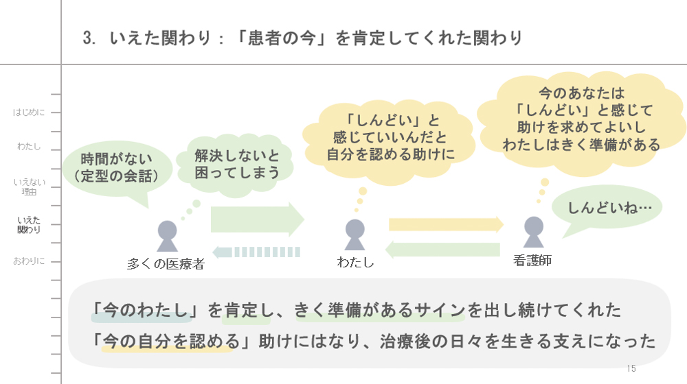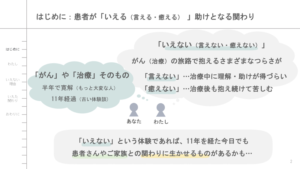 次に、治療中の「いえなかった(言えなかった・癒えなかった)」体験を、いくつかの具体的な場面や言葉、理由とともにお話して、そんな「いえなさ」を感じとり触れてくださった医療者の方の関わりや、治療後に「いえる(言える・癒える)」ようになったいろんな方々の関わりについても少しご紹介します。