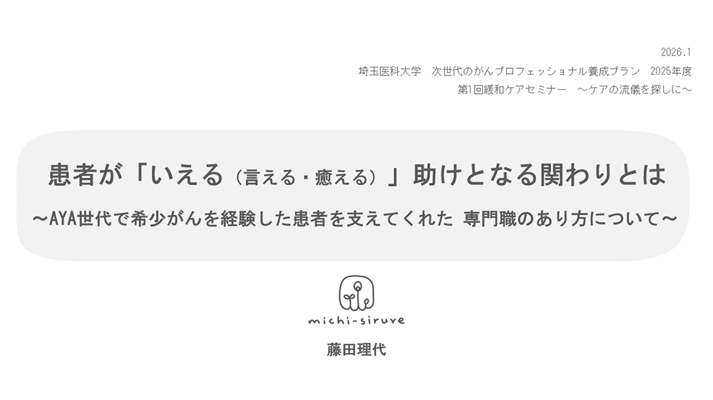 2026年1月、埼玉県川越市にある埼玉医科大学総合医療センターで開催された「埼玉医科大学 次世代のがんプロフェッショナル養成プラン 2025年度、第1回緩和ケアセミナー ~ケアの流儀を探しに~」にて、がん経験者として体験をお話しました。