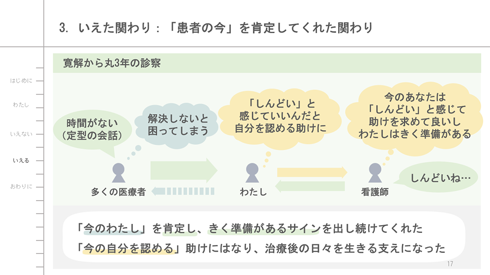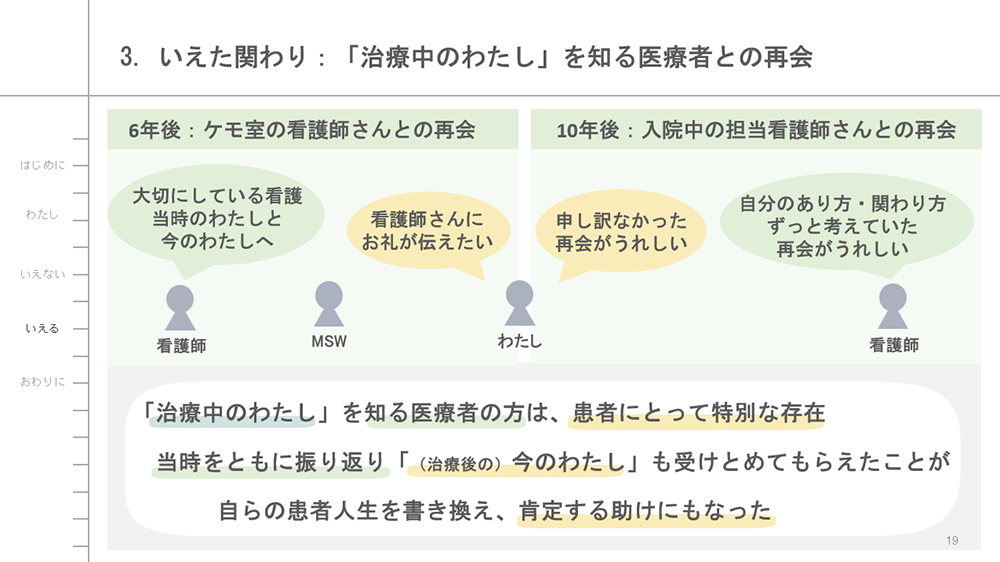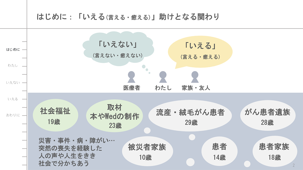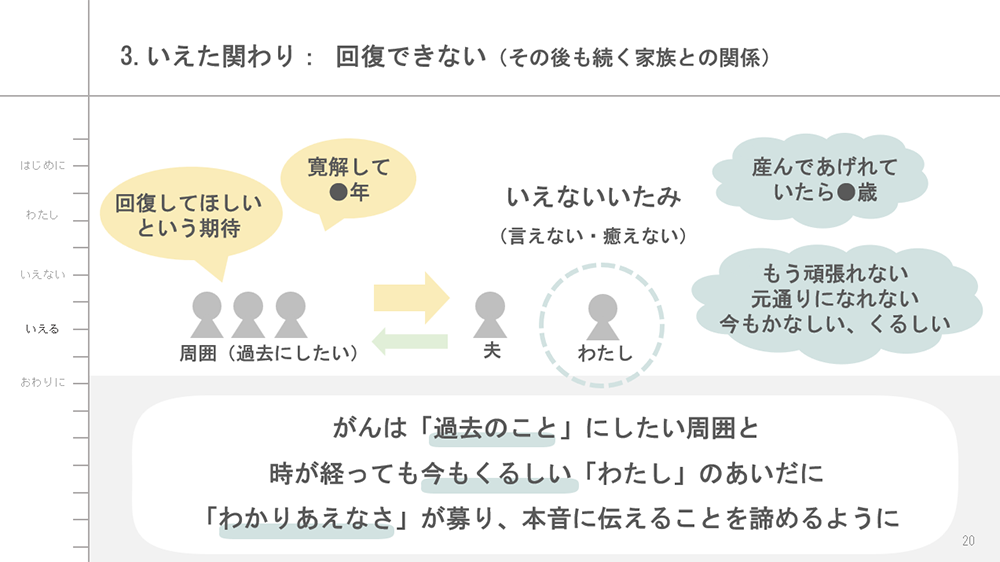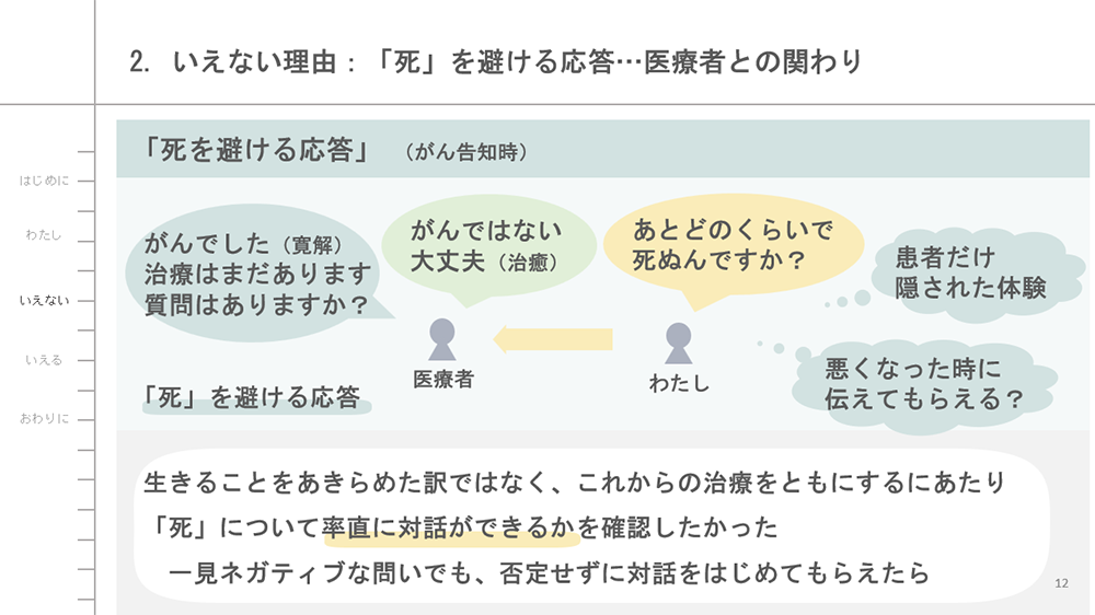 がんという、大切なものを突然に失う体験の中で「いえなかった(言えなかった・癒えなかった)」患者としての体験と、周囲の助けを得て「いえる(言える・癒える)」ようになった12年あゆみについて。