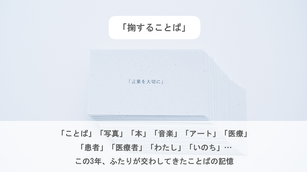 お声がけくださったのは、これまでもフェリス女学院大学での講義や「ホスピタルアート in ギャラリーⅣ」の展示やトークセッションなどさまざまな場所でご一緒してきた、そして『ココロイシ』『汀の虹』の音楽やZINE『掬することば』緩和ケア医の儀賀理暁さん。