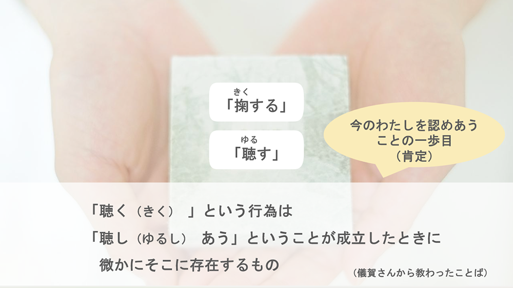 「あり方」をともに考える。そんな答えのないテーマを考えるためのみちしるべにしたのが、スライドの最初と最後にも入れていた、儀賀さんから以前教えていただきずっと手に持っていた「聴す(ゆるす)」ということばでした。